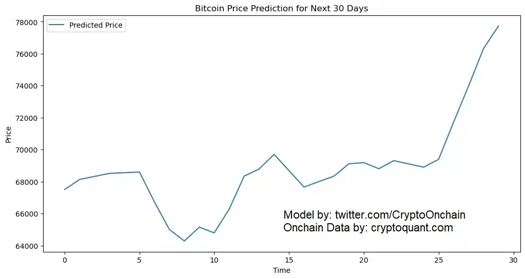 A new experiment published by cryptocurrency analytics platform CryptoOnChain: their proprietary deep learning model predicts that the bitcoin price will not only return, but potentially surpass its previous all-time high in the next 30 days. The AI believes that the number one cryptocurrency could break the $70,000 mark in just 25 days and reach the $78,000 level by the end of May.