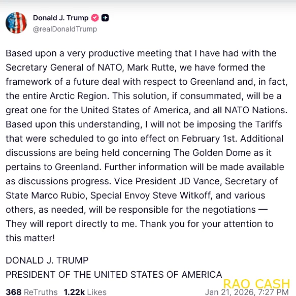 ट्रंप के अपने सोशल मीडिया अकाउंट, ट्रुथ सोशल पर एक पोस्ट पब्लिश करने के बाद हालात बदल गए, जिसमें उन्होंने NATO सेक्रेटरी जनरल मार्क रूट के साथ एक फ्रेमवर्क एग्रीमेंट पर सहमति की घोषणा की। इस खबर को एक सिग्नल के तौर पर देखा गया कि मुख्य यूरोपीय सहयोगियों के खिलाफ आने वाले ट्रेड उपायों की संभावना कम हो गई है, जिससे रिस्की एसेट्स खरीदने की लहर शुरू हो गई।